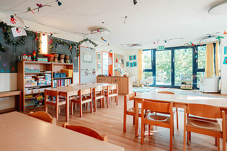 Voneinander lernen und miteinander etwas erleben - das wird im DRK-Zentrum "Haus am Steinberg" tagtäglich gelebt. Seit 2005 gibt es unsere fröhliche Kindertagesstätte im DRK-Zentrum "Haus am Steinberg" - einem Ort der Begegnung zwischen Jung und Alt. 2014 ist eine Krippe hinzugekommen. Mit seinem Konzept der Seniorenbetreuung in Hausgemeinschaften, seinen unterschiedlichen Pflegeeinrichtungen auf einem Gelände sowie der Integration eines Kindergartens und einer Krippe war und ist das "Haus am Steinberg" Vorreiter - regional und bundesweit. Die freiwillige, generationsübergreifende Arbeit zwischen den Kindern und den Senioren findet in Form von gemeinsamen Singen, Backen oder Gärtnern statt. Beide Seiten lernen voneinander und bereichern ihren Horizont.